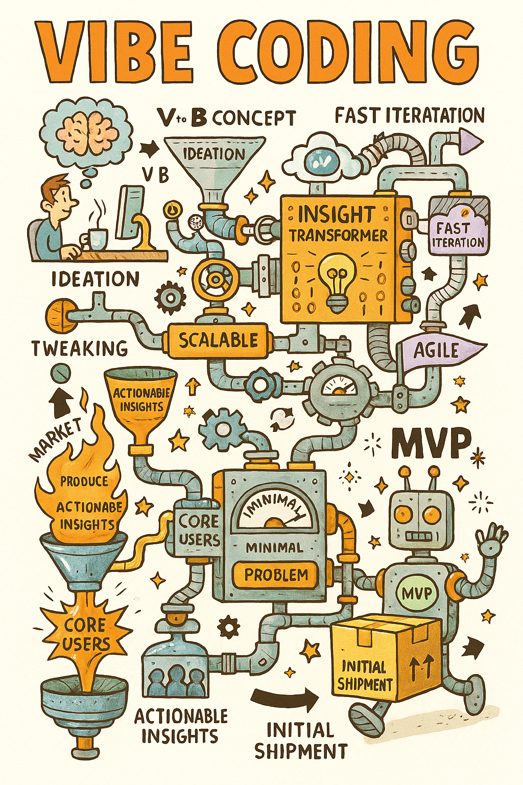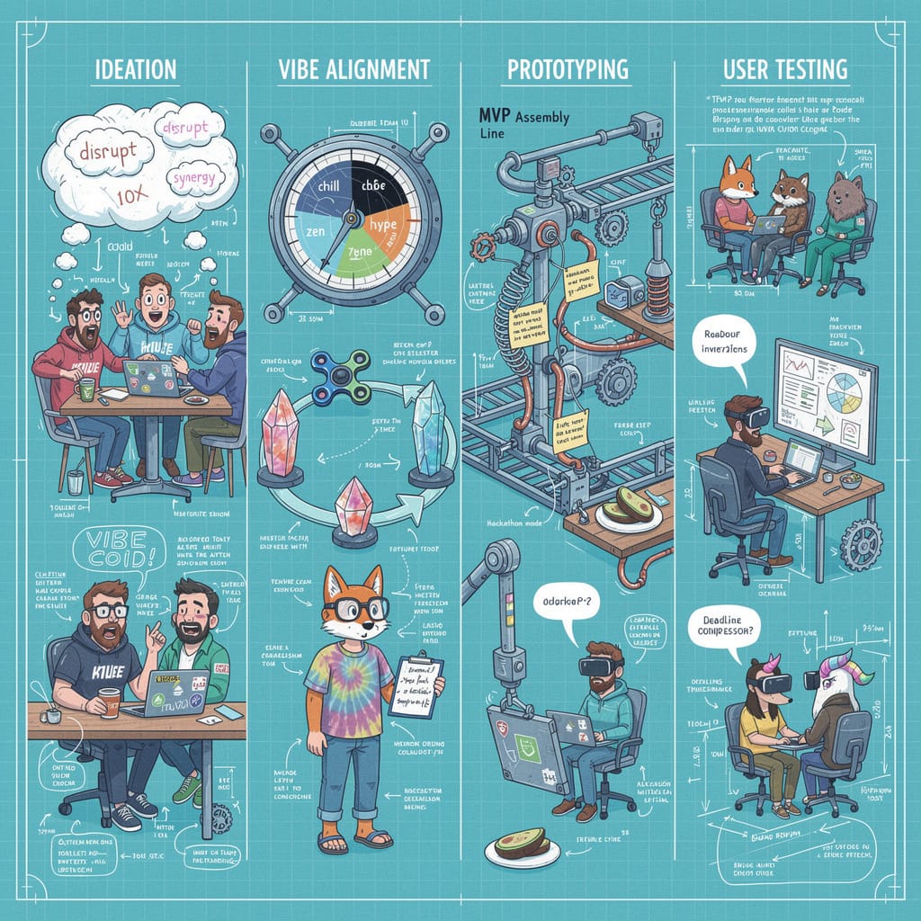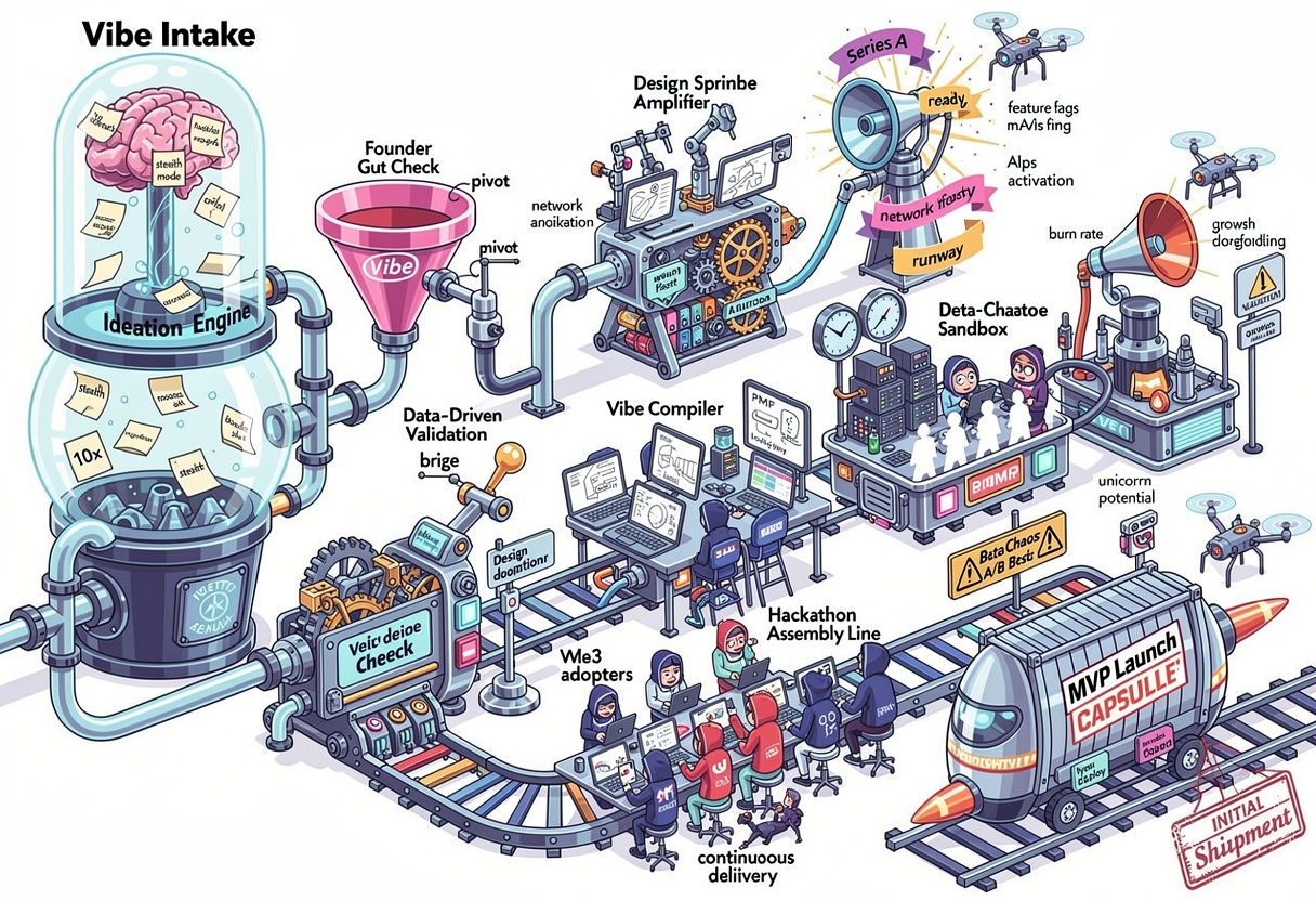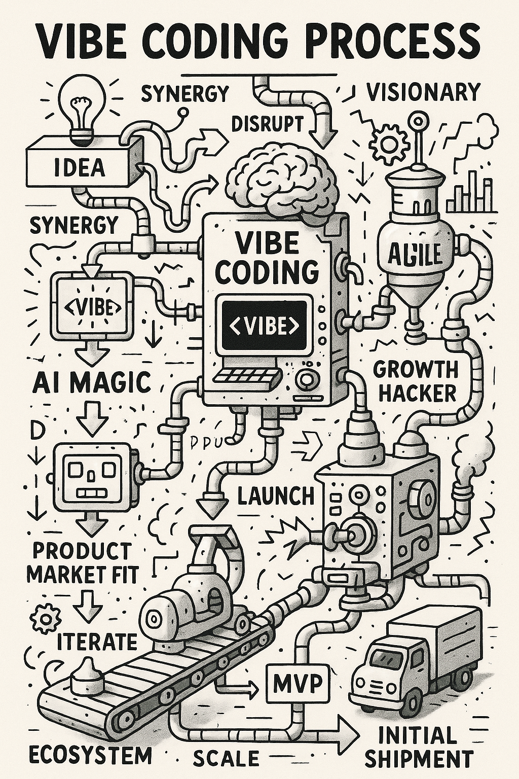 Create a 2D mechanical style drawing of the vibe coding process. Start from ideation of the concept to be vibe coded and add in the stages all the way up through initial shipment of the MVP.