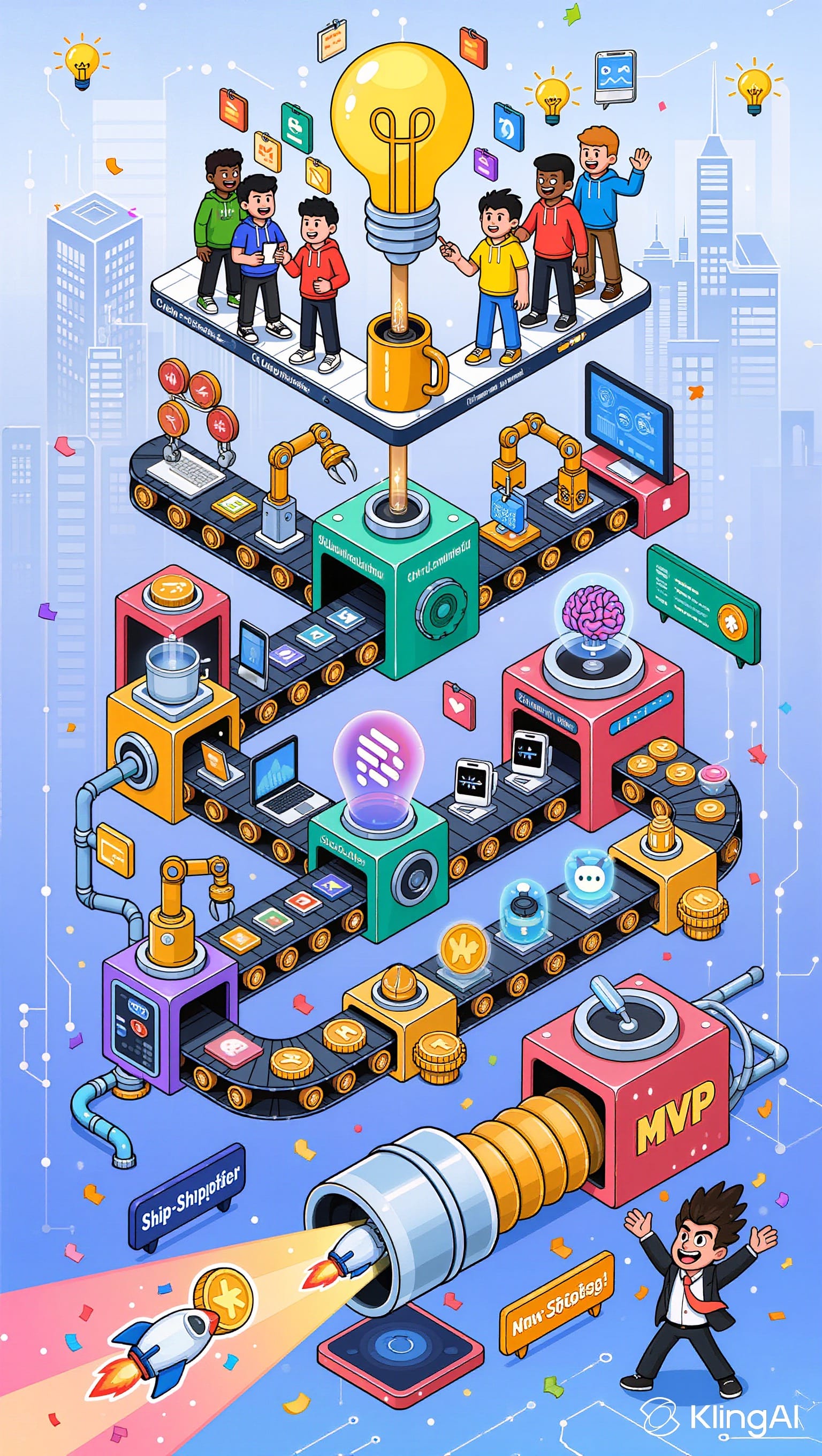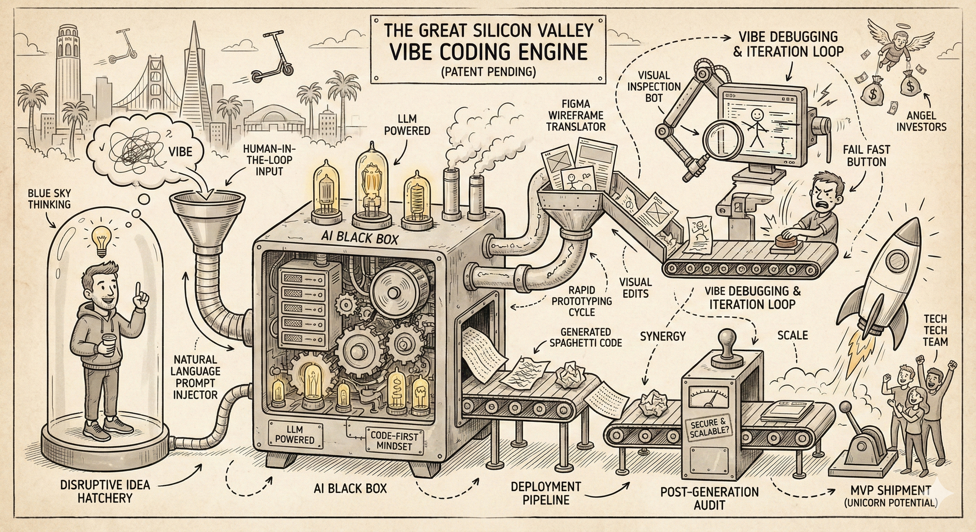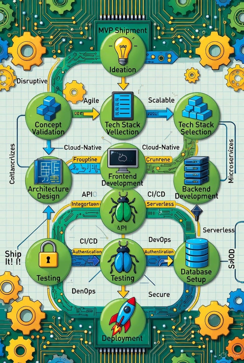 Create a 2D mechanical style drawing of the vibe coding process. Start from ideation of the concept to be vibe coded and add in the stages all the way up through initial shipment of the MVP.